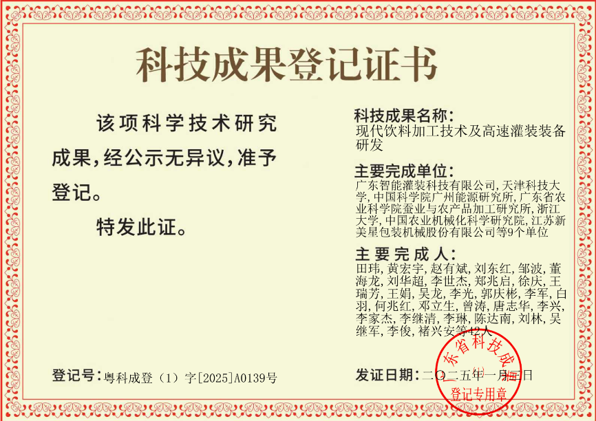 2025年1月,由田玮教授牵头,广东智能灌装科技有限公司、伟德国际1946、中国科学院广州能源所等单位完成的广东省重点研发计划项目“现代饮料加工技术及高速灌装装备研发”,进行了科技成果登记,项目研发了饮料及包材高效消毒灭菌技术,开展了广东特色饮品加工工艺适配性开发,研制的高速无菌旋转式吹灌旋包装装备打破了国外技术垄断。