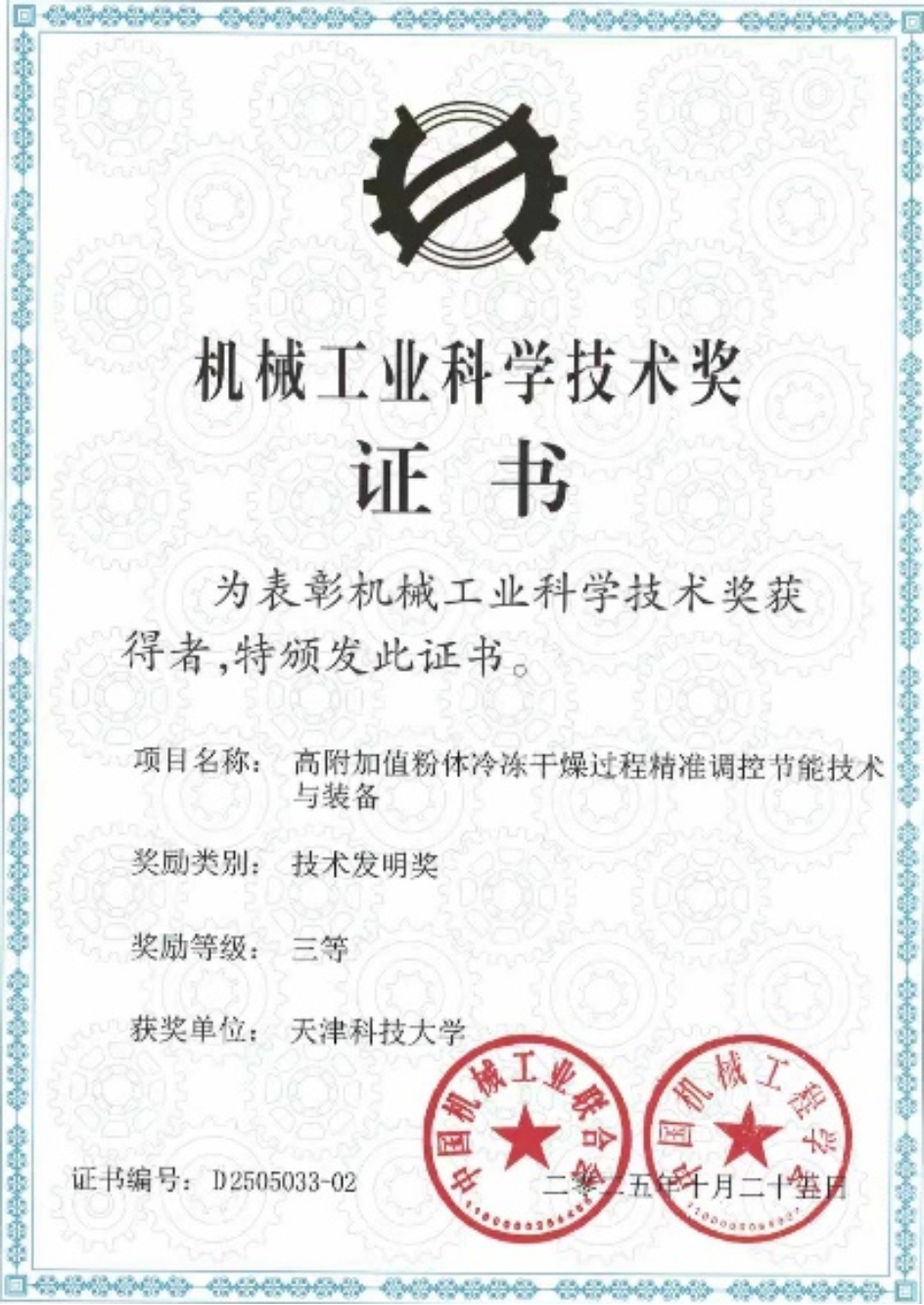 2025年10月,我校校友、河套学院张帆副教授与我校徐庆教授合作开展的“高附加值粉体冷冻干燥精准调控节能技术与装备”项目顺利结题。该项目成功研制系列液态食品高效冻干装备,在提升产品品质的同时实现高效节能,为液态食品高值化转化提供了关键技术支撑,荣获由中国机械工业联合会、中国机械工程学会联合颁发的“机械工业科学技术奖”技术发明三等奖。