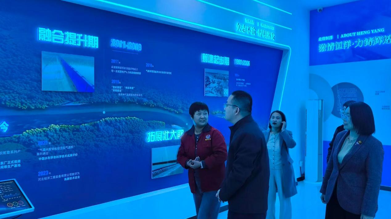 在河北恒洋工程装备有限公司,学院教师参观了企业展厅,详细了解了公司闸坝类产品的设计原理、技术特点及演示模型。企业负责人介绍,公司生产的气盾坝、橡胶坝、液压坝等产品,在机械设计、力学分析、结构优化等方面存在广泛技术需求,希望与学院开展专项合作,共同推动产品迭代升级、提升产品核心竞争力,双方就后续合作方向达成初步共识。