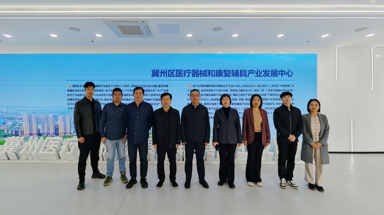 在冀州区工信局领导的陪同下,学院一行首先前往冀州区医疗器械和康复辅具产业发展中心参观考察。在现场讲解员的引导下,老师们深入了解了冀州区医疗产业集群的整体发展态势、产业布局及未来规划。展厅内陈列的展品涵盖医疗领域的全系列产品,其中面向未来老龄化社会的适老化空间家具等特色产品设计,获得了老师们的广泛关注。交流中,工信局相关负责同志结合区域产业发展实际情况,提出了若干亟待解决的设计类难题,希望借助学院工业设计学科优势和平台资源,为区域产业集群高质量发展注入设计活力与科技动能。