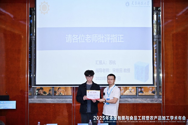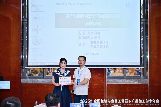 大会开幕式由中国包装和食品机械有限公司党委书记、董事长周海军研究员主持,中国机械工程学会与中国农业机械学会领导分别致辞。主题报告由浙江大学刘东红教授主持,朱蓓薇院士做了“AI重构饮食生态——食品工业4.0赋能家庭烹饪智能体的技术跃迁”的大会主题报告。在专题分会场,我院宋继田教授、徐庆教授、郑兆启副教授参与主持并组织报告,博士研究生李丽梅、苏杭作了学术报告,介绍了相关研究进展与成果。