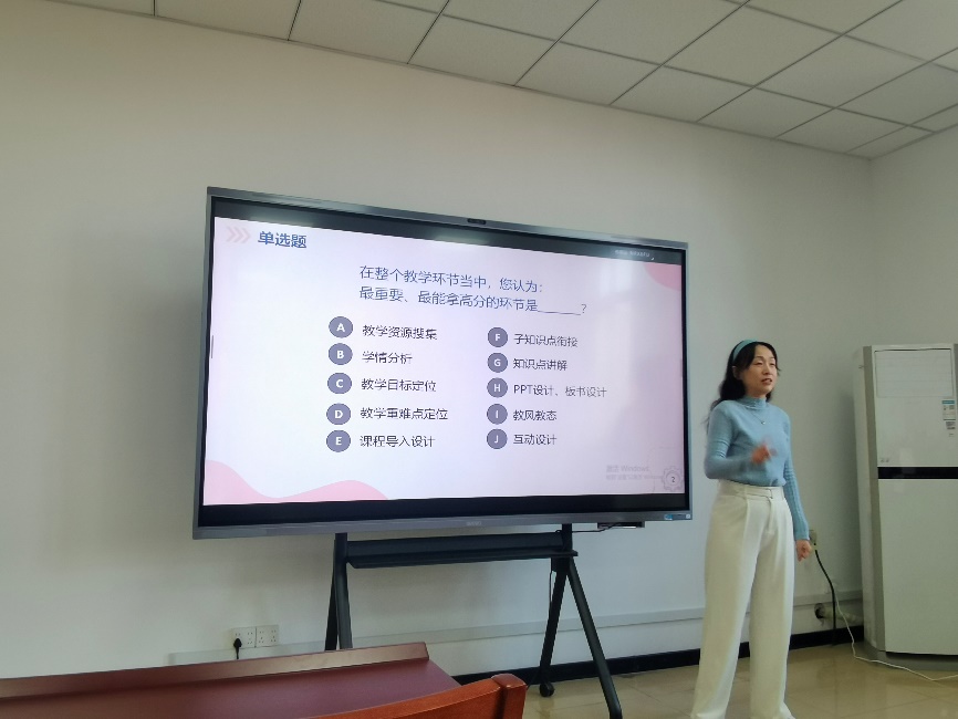 竞赛开始前一周,学院邀请第十七届天津市青年教师教学竞赛一等奖获得者——霍冰老师为大家做竞赛交流,霍冰老师从“标配”“高配”“顶配”三个层次,对竞赛评分指标做了详细解读,并强调了课程导入设计的重要性。