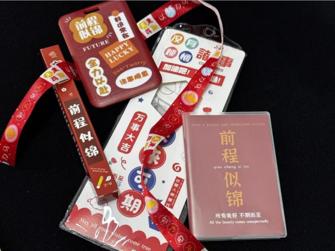 礼包里包括定制的“未来可期”系列文具、“好运常在”卡套、“前程似锦”单词本等,每一份礼物都承载着辅导员老师的美好祝愿,每一个礼包都凝聚着学院的细致关怀与殷切期许。