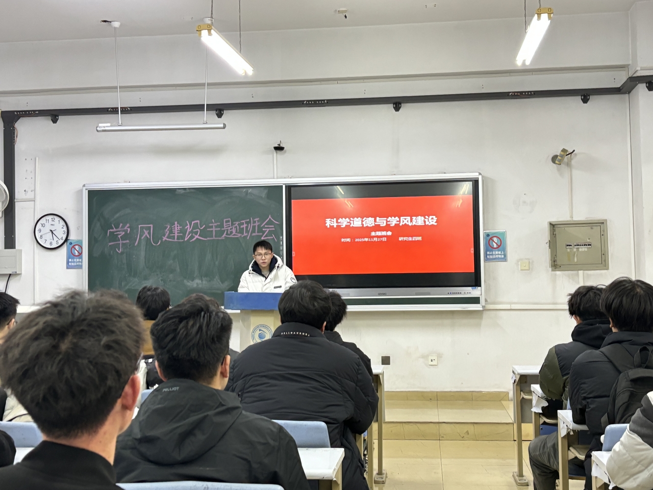 活动以班级为单位,通过主题班会、学术规范解读、典型案例剖析、学长经验分享等多种形式开展。各班班主任围绕科研诚信、论文写作规范、学术不端行为界定与防范等核心内容进行细致讲解,结合学术界真实案例深入剖析学术不端行为的危害与后果。同时,邀请高年级优秀研究生分享科研心得,与新生交流如何平衡科研与学习、规避学术风险,现场互动氛围热烈。